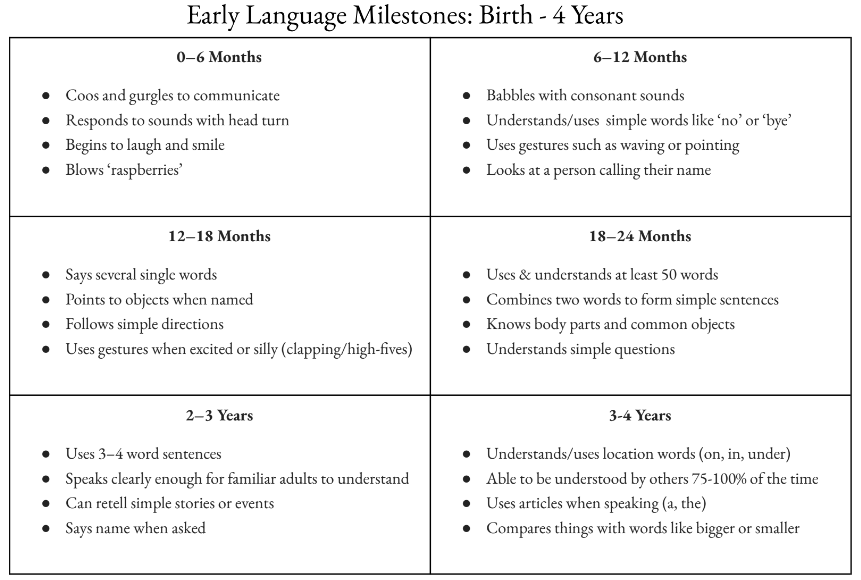 Click here to learn detailed information about early language development, milestones, and language strategies to use at home